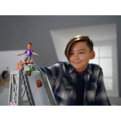 Includes: 1 Drop-In Tower, 1 three-foot-long ramp, 1 Quarter Pipe Ramp (with adjustable ramp heights), 1 Trick Bar, 1 Deco Sticker Sheet, and Instruction Sheet. Boneless skater, skateboard and charger not included.