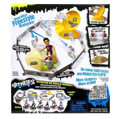 #Boneless is a line of incredible electric-powered, mini stunt skateboards with hyper-poseable skaters and crazy stunt playsets. This #Boneless CrayplayTM set lets skaters ride, slide, grind, spin and flip their way through the park. Skate around, slam into the fence, and ricochet off. Rip over the All-Way Ramp, or onto the Warp Rider Vert Ramp, and go for a 360 flip! Get ready for some seriously EPIC FAILS, but keep trying ‘til you #StickTheTrick!