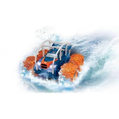 The Brookstone Amphibious Stunt Force R/C Vehicle is prefect for land and water play! With a range of 131 ft the R/C vehicle can climb out of the water and onto land for fun on any terrain. The Amphibious Stunt Force includes a remote control, rechargeable battery pack, USB charging cable, tire air pump, inflatable tire gauge card, screwdriver, AA batteries, instruction booklet.
