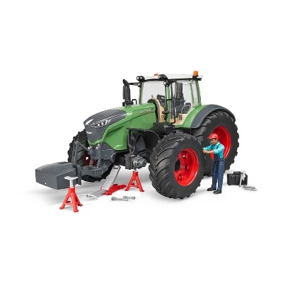 The new Fendt 1050 Vario is fendt’s top-of-the-range product Model. This tractor really owns up to attributes, such as Big, strong and unique! Its design, handling and traction force are unique. With this item Bruder is showcasing the first 04041 of the new 4000 Series. It represents a new reference point with an outstanding attention to detail, is easy to play with and comes with the typical Bruder characteristics, high levels of toughness and quality. The 04041 also features established characteristics, such as the steered front axle or the height-adjustable rear coupling to attach any professional Series trailer. However, there are also some new functions, such as the re-designed front mount to attach accessories and the special highlight, re-developed axles with detachable wheels. Thanks to the enclosed mechanic figure including tools and Jack, wheel changes and any other repairs can be recreated with ease.