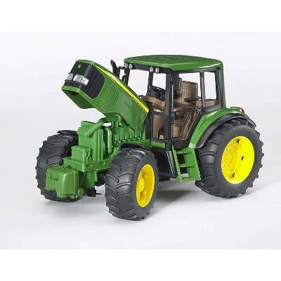Bruder 16th scale tractor 6920 with front loader. Independent front axle steering that allows off-road application. Equipped with additional steering rod, that can be attached to the steering wheel via the opening sliding roof for comfortable steering. Double wheels item 02321 can be attached (LP53508 sold separately). John Deere Tractor 6920 with front loader.