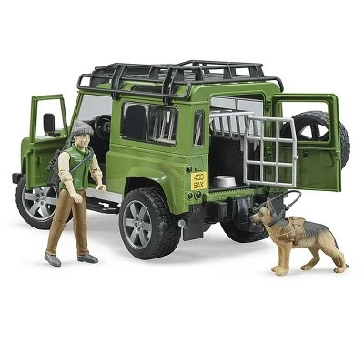 Forest rangers are responsible for managing forests. They decide on which trees and animals flourish within forests. Sustainable management in line with economic, ecological and social aspects are paramount and require forest rangers’ great commitment and specialist expertise. Forest rangers’work is particularly important as part of conservation and preserving healthy forests. The BRUDER forester comes equipped with rifle, binoculars and hunting knife. His loyal Alsatian is always by his side during his day-to-day activities. As the BRUDER forester often works in challenging terrain, he must rely on a reliable vehicle. The Land Rover Defender Station Wagon combines fascinating off-road capability with durable design. Like all BRUDER vehicles this model was also based on the original in great detail. Thanks to its surprising details, such as the raised structure panel on the bonnet and the numerous functions not just Land Rover aficionados will be convinced by the developed model. In addition to the opening rear door as well as side doors, the bonnet opens to show off the detailed engine block. The rear seat and the drawbar coupling can also be removed. Suspension on both axles means there are no terrain boundaries during play time. The front axle can also be steered using the additional steering column (within the scope of delivery), familiar from BRUDER tractors to give you a more natural playing experience. The matching transport kennel is included in this great set to safely transport the dog.