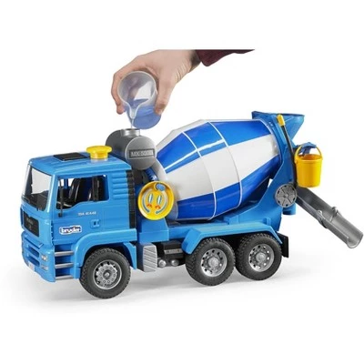 The MAN Cement Mixer has a hand wheel that turns the drum and actually moves its contents. The Drum empties through the chute. The chute is adjustable and water actually drains out of the water tank through the hose of this cement truck. It has a removable bucket, and soft rubber Tires with real tread. The Cab of this cement mixer actually lifts forward to reveal the engine.