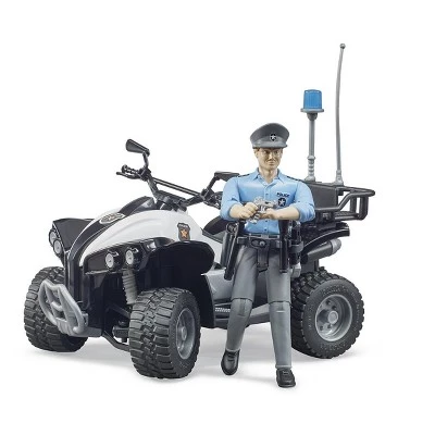 Just like in normal life, an increasing amount of traffic with BRUDER vehicles means traffic violations are on the rise. For this reason, bworld now also features a police force to enforce law and order. A quad bike unites the compact dimensions of a motorbike and the flexibility of a cross country vehicle. Consequently, it is hardly surprising that the police are increasingly using quad bikes. The BRUDER quad bike has a very modern police design to leave an impression during day-to-day activities as well as on challenging cross country terrain during a pursuit. The suspension on both axles and the steered front axle makes the quad bike very agile and enables precise maneuverability even on the toughest terrain. The quad bike is ideally suitable as a day-to-day emergency services vehicle with its removable luggage rack, drawbar coupling and brackets for tools. The lifelike vehicle replica comes complete with a bworld police officer that lends the set a very realistic appearance. A fixed handle on the handlebars and a seat adapted to a sporty rider position means the rider never loses control, even when racing over rough terrain.