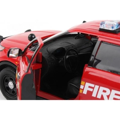 This is a 1/24 FDNY Ford Explorer SUV by Daron Worldwide Trading Inc. This die-cast metal FDNY fire chief SUV features authentic exterior and interior details, opening doors and rubber tires. It is officially licensed by New York City, and all logos and marks are certified by the FDNY. It is recommended for children ages 5+ and measures approximately 8.5 x 3 x 2.75 inches.