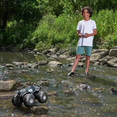 Take your Batman missions to the next level with the All-Terrain Batmobile in 1:15 scale! This remote control Batmobile lets you drive from land to water and keep on going! This remote control vehicle is built with performance tires for unstoppable performance as you race through all-terrains! Water, snow, mud, rock, and grass is no match for the All-Terrain Batmobile! The 2.4 GHz dual joystick remote control is USB rechargeable and features out-of-range sensors so you’ll know when your Batmobile needs to stay in range, recharge, and return to land! Perfect for outdoor play! The iconic Batman vehicle is compatible with all 4” Batman action figures (sold separately). DC fans of all ages love this Batmobile collectible to engage their imagination and create their own epic superhero missions! Load your Batman figure (sold separately) into the driver’s seat and get ready to drive from land to water! Bring the excitement home with Batman toys. This Batmobile RC car is ready to fight Super-Villains everywhere!