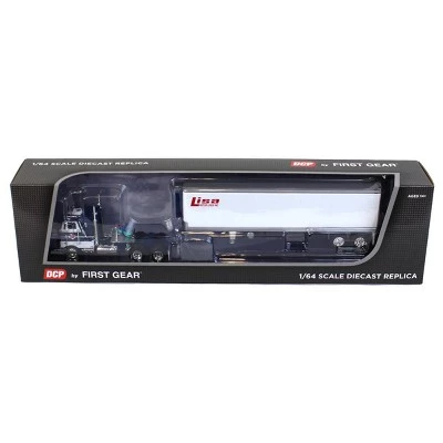 This 1/64 scale Peterbilt 352 Sleeper Semi is made by First Gear. The semi truck is paired with a 40’ vintage trailer with reefer, Fallen Flag #37, Lisa Motor Lines. The truck and trailer are made from diecast metal with detailed plastic and rubber wheels. This item is recommended from the manufacturer for ages 14+ years and up.