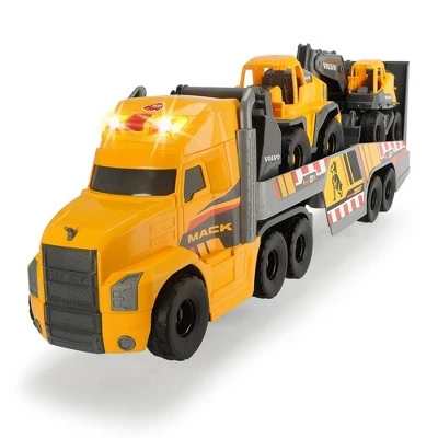 Dickie Toys Heavy Loader Truck: for budding builders. This Volvo-inspired toy set from Dickie Toys allows your little one to create their own fantasy construction site. The Dickie Toys Heavy Loader Truck Set includes a large Mack truck with a loading surface, which carries the Volvo excavator and loader from the On-site series. The shovel arms and shovels on the construction vehicles can be moved, as can the tailgate on the truck. Even without the trailer, the truck can be used to create a wide range of imaginary scenarios thanks to its built-in light and sound effects. The toy set is designed for children aged 3 and above and is the perfect introduction to the exciting world of commercial vehicles. WARNING: CHOKING HAZARD — Small parts. Not for children under 3 yrs.