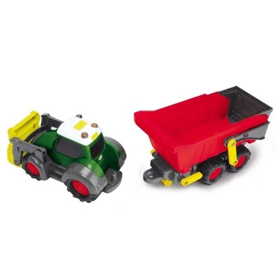 The Happy Farm Trailer with trailer is equipped with a freewheel function and is a winner with its impressive size of 25 inches. In addition, the saliva-proof tractor is equipped with a freewheel function as well as light and sound. The front scoop can be manually moved up and down and removed for loading the trailer. The trailer can easily be connected or disconnected to the trailer coupling and unloaded manually. This toy tractor, with its rounded shape and no dangerous corners or edges, has a child-friendly design. The tractor’s big eyes lend it a friendly character and give little farmers a realistic insight into the world of agricultural machinery. The Happy Farm Trailer was developed in collaboration with Fendt and is suitable for little farmers aged 12 months and over. In addition to fine motor skills, it particularly encourages a thirst for discovery. Go on a journey of discovery with Dickie Toys and bring joy to little junior farmers with the Happy Farm Trailer. WARNING: CHOKING HAZARD — Small parts. Not for children under 3 yrs.