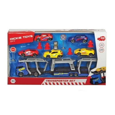 Dickie Toys Car Carrier: Much more fun than normal piggybacks! With the Dickie Toys Car Carrier, the fun increases in line with the number of axles. The free-wheeling car transporter has space for five die-cast toy cars, which are also conveniently included in the set. Additional moving parts ensure authentic-looking loading and unloading. Extra traffic signs make up a perfect playset! WARNING: CHOKING HAZARD — Small parts. Not for children under 3 yrs.
