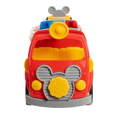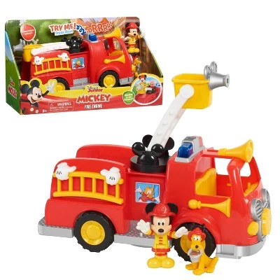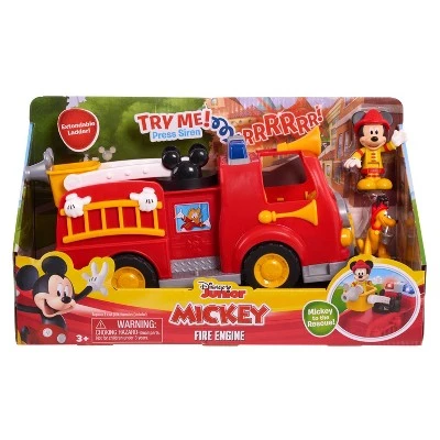 “Mickey’s on the way to save the day” with this lights and sounds fire engine inspired by Disney Junior’s Mickey Mouse Clubhouse Adventures. Featuring fun Mickey phrases and real fire engine and water sound effects, the Helping Hands Fire Engine also includes one 3” articulated Mickey Mouse figure and one Pluto figure. Kids can place Mickey and Pluto in the cabin and roll into any adventure. Place Mickey in the ladder basket and pretend to put out the fire. Pluto is right by his side holding a bucket of water to help. Press the siren on the top of the truck and watch it light up. The realistic siren sound effects and Mickey Mouse phrases help to bring kids’ imaginations to life. Requires 2 x AA batteries (included). Ages 3+