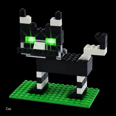 This kit provides a unique, patented technology that enables you to build 3D circuits into your structures without any wires! The tin plated parts in this set are conductive so they can be used to create 3D circuit paths from the battery module to the LED modules provided in this set to integrate lights into you structures. Online instructions show you how to build a cat whose eyes light up red, blue or green and can even flash on and off!