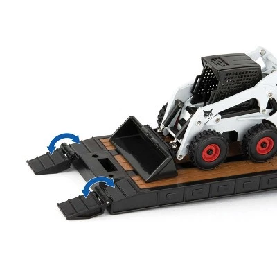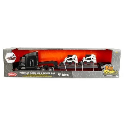 This 1/32 Bobcat set features the Peterbilt Model 579 with Bobcat graphics on the doors, two die-cast Bobcat Model 450 skid steers loaded on the drop deck trailer. Trailer hitches and unhitches easily from the tractor.This 1/32 Bobcat set features the Peterbilt Model 579 with Bobcat graphics on the doors, two die-cast Bobcat Model 450 skid steers loaded on the drop deck trailer. Trailer hitches and unhitches easily from the tractor. The die-cast skid loaders feature a fully functioning front loader with tilting bucket. Exceptional play value with this set. Recommended for ages 3+ years and up.