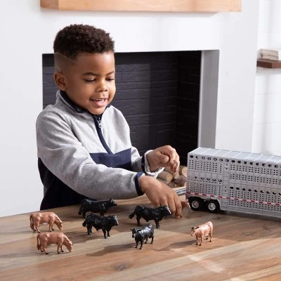 This item is a part of the Big Roads line of playable kids toys by TOMY ERTL. This set features a Freightliner 122SD day cab, a livestock trailer and eight head of cattle. The grain trailer has an opening tarp and opening rear grain doors with fold down ramp for easy unloading! This set is constructed of durable plastic and is perfect for both indoor and outdoor play. Recommended for ages 3+ years.