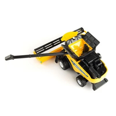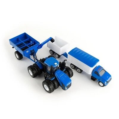 Made by ERTL, this 1/64 scale harvesting set comes with 7 unique items: A yellow New Holland CR9.90 Combine, a blue New Nolland T9.645 4WD Tractor with Duals, a blue J&M Grain Cart, a blue and white Straight Truck with Grain Box, a blue and white Pup Trailer, Cornhead and Grainhead. Per the manufacturer, this item has a recommended age of 8+ years.