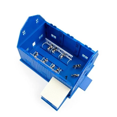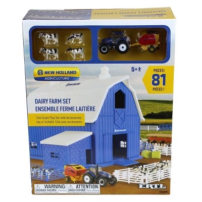 The 1/64 ERTL Farm Country New Holland dairy barn lets youngsters experience the best of country living, whether they are in the heart of farm country or the middle of the city. The New Holland barn comes in New Holland blue and the New Holland logo is prominently featured on the roof as well as above the sliding doors. This set includes the 1/64 T6.165 Tractor and Roll-Belt 560 Round baler as well as the easy to assemble plastic buildings, animal figures and a generous helping of accessories.