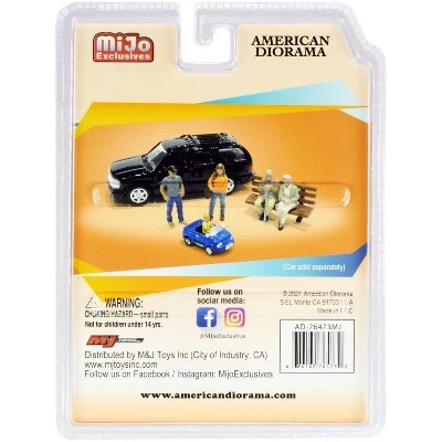Brand new 1/64 scale diecast models of “Family” Diecast Set of 6 pieces (5 Figurines and 1 Accessory) for 1/64 scale models by American Diorama.Limited edition.Brand new box.Made of die-cast metal.Comes in a blister pack.Does not come with the car shown.Each figurine is approximately 1 inches tall.Only 4 figurines, a boy in a car and a bench will be received.