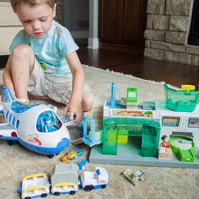 Send your little ones imagination soaring! From the ticket counter to the clouds, this beautiful play set is packed with all kinds of realistic details that turn the entire airport experience into a wonderfully open-ended play time adventure. Press the clerk at the ticket counter into their seat to hear them speak – Enjoy your flight! – and then load the luggage onto the carousel and turn the dial to send it sliding around to the back. Inside, theres another button in the floor kids can push for more words of welcome as they move to the yellow seats where they can wait for their flight to arrive. Upstairs theres a special scanner for checking their carryons while the staircase on the side pivots out for access to the tarmac. Its finally time to fly! Open up the side door of the included airplane and fold down the stairs to begin boarding. Upon entrance, a button on the floor welcomes little ones aboard as they make their way to their reclining seats. More buttons in the floor present messages from the flight attendants while another button in the captains seat lets the captain speak to the passengers. And all the while… Down below, an airport worker has arrived in a luggage carrier with two carts of luggage in tow – Open up the cargo hatch to load it all onto the plane! Brimming with fascinating details, exciting sounds, and all the accessories your little one needs to bring it all to life, the Airport Playset is sure to inspire hours of enlightening pretend play. Airport Playset Detailed airport pretend-play set featuring detailed accessories, lights, and sounds Encourages fine motor skills, imaginative play, storytelling, role-play, creativity Press clerk at ticket booth for fun music and encouraging message Press floor button for a welcoming message – Departures screen lights up Turn dial to spin the luggage carousel Wait in the waiting area for flight to arrive – Go upstairs to have your luggage checked Side staircase pivots out for boarding Also features air traffic control tower Airplane features opening side door with fold-out stairs, opening roof for easy access to interior, 4 reclining seats Captains chair features button for airplane sounds and messages from the captain Floor features buttons for messages from the flight attendant Hatch opens underneath plane for loading luggage Luggage carrier features 2 removable carts Includes airport, airplane, luggage carrier with 2 carts, large cargo container, 2 suitcases, personal luggage cart, 6 play figures (captain, air traffic control officer, engineer, 2 passengers, ticket counter clerk) Airport requires 3 AAA batteries – Not included Airplane requires 2 AA batteries – Not included Airport measures 15.75 x 8.5 x 6.75 inches Airplane measures 14 x 11 x 7 inches Features switches for changing from English to Spanish High-quality design and materials, BPA-free, nontoxic – Exceptionally durable and safe