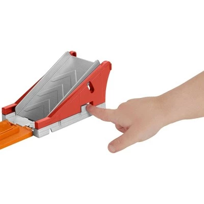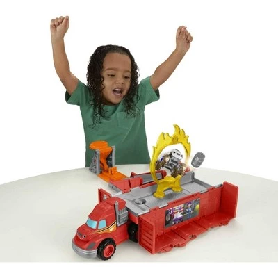 Kids can bring to life all the cool stunt racing action from Nickelodeon’s Blaze and the Monster Machines with this Launch & Stunts Hauler vehicle and playset from Fisher-Price. This action-packed, 2-in-1 playset transforms from a push-along big rig trailer to an awesome stunt set, complete with jump ramp, ring of “fire,” and Gabby’s garage. Young racers can launch the die-cast Darington truck from the ramp and send him soaring through the “flaming” hoop to hit the barrel. BAM! Kids can reposition the ramp and hoop to create even more challenging stunts.