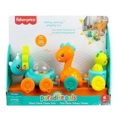 Get baby’s gross motor skills chugging along with the Fisher-Price Paradise Pals Dino Choo Choo Trio! This push-along toy train is made up of three dinosaur-themed vehicles, each with its own fun busy activity for little ones to explore. As your baby rolls the dinos along, they each come to life with fun actions, including popping rattle beads, head-bobbing, and spinning. Push them along on their own, or link them all together to form a super cute dino train for your baby to crawl and chase after!