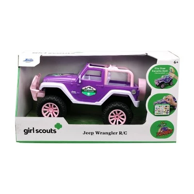 Girl Scouts by Jada Toys combines individuality and character to an all-customizable Jeep R/C that girls can relate to. If you are an outgoing girl who loves adventure, your unique touch applied to this Jeep, with its large off-road wheels, will take you there in style. Featuring custom styling, these full function radio control cars are not only fun, but they also look great as well Girl Scout Jeep RC requires 3 AAA batteries for the vehicle and 2 AA batteries for the controller. Girl Scout Radio Control cars function at a 2.4 GHz frequency enabling up to 16+ players to play at a range of 100 feet. These cars are suitable for children ages 6+.