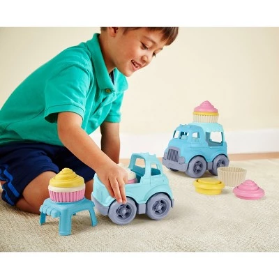 Get ready for a delivery of sweet treats full of imagination with the Green Toys™ Cupcake Trucks! This 16 piece mix-and-match set includes a two Cupcake Trucks with removable canopy trays, and frosting, cakes, and cupcake liners for 4 complete cupcakes. Each truck holds a cupcake in the back bed, and another cupcake on the roof – which doubles as serving trays and is perfect for presentation and storage. Made in the USA from 100% recycled plastic milk jugs. No BPA, PVC or phthalates. Recommended for ages 2 years and up.