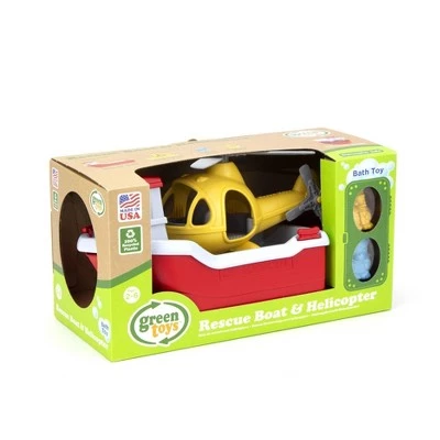 - Green Toys Rescue Boat and Helicopter is a 4 pieces set that includes Rescue Boat that fits full-size Helicopter on the deck, as well as Captain Duck and Pilot Bear characters