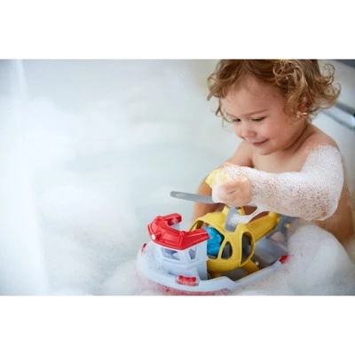 No water rescue is out of reach when the Green Toys Rescue Boat and Helicopter gets the call! This two-in-one toy is just as fun on land as it is in water, with a bright yellow, full-size Helicopter nestled on the back deck of the red and white Rescue Boat. The set also includes two characters – a Captain Duck and Pilot Bear – ready to go wherever your child’s imagination takes them. Specially designed to float in the water and open for the dishwasher, this ship is a perfect addition to any bathtub fleet.
