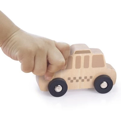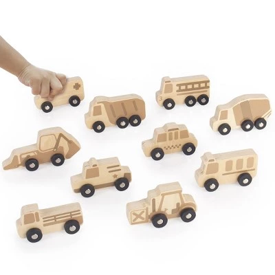 Give context to architecture and communities with hand-held, birch plywood trucks. Each features natural-toned, heat-transfer designs to associate seamlessly with traditional unit block play. Give roadways and block buildings purpose and develop group play skills with 10 pieces to share. Vehicles include: cement mixer, fire truck, police car, taxi car, school bus, dump truck, ambulance, fork lift, front loader and farm truck.