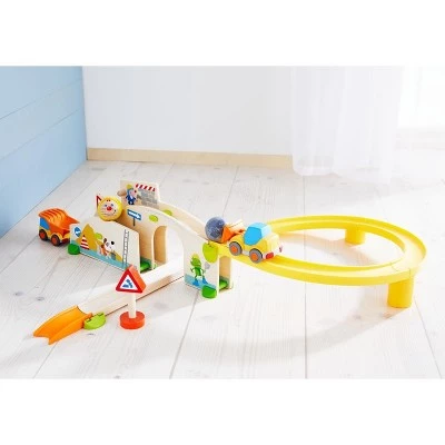 - 13 piece set includes: 1 construction site efffect, 1 traffic sign, 3 universal steep curves, 1 straight track, 1 exit ramp, 1 ball Builder Ben, 1 ball building rubble, 1 free-wheeling dump truck with movable bed, 1 wheel loader with momentum motor and 2 connecting elements.