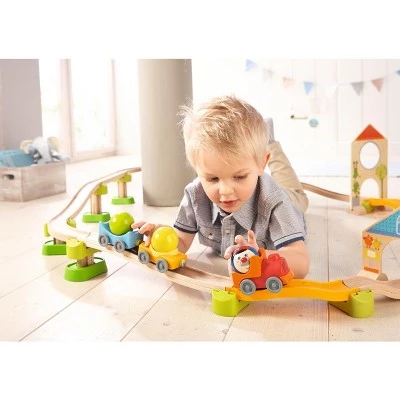 Egon’s train makes a delightful compliment to both the Play Track at the Construction Site Set #303081, City Stroll Set #303082 and the Jump into Car Dominoes Set #303088 all of which provide an avenue for balls to roll and drop right into the train cars and take off! Contents include: 1 red and orange locomotive engine, 1 orange and yellow wagon, 1 blue wagon, 1 Engineer Egon ball and 2 Kullerbu Balls. Enjoy unlimited Kullerbu wheeling wonder both on and off the track!