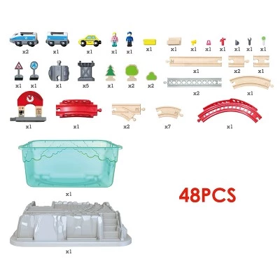 - RAILWAY TOY SET: 48-piece travel-friendly wooden railway set includes a magnetic crane and a realistic engine