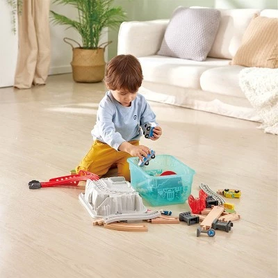 If your child loves playing with train sets and operating vehicles, they’ll love the Hape City Railway and Train Bucket Set Toy.This gorgeous railway-themed set comes with a realistic station with a magnetic crane for moving cargo around. This set includes a total of 48 pieces with track parts that come together to form a loop for moving trains, trucks, and cargo. The track kit comes in a storage box which forms part of the scenery. The train set comes with 2 carriages, a taxi, 2 trees, a bush, signs, 2 figurine characters, and other tools for more realistic play. To clean this set, simply wipe it with a damp cloth and leave it in a dry area. This railway pack promotes hand-eye coordination, agility, stimulates creativity, and encourages imaginative play in early development. Crafted from durable wood and non-damaging paint, this trusted toy can last for several years as your child matures. Toddlers ages 3 and up will love this handy set.Kids can run wild with their imagination with the help of the Cargo Delivery Loop Railway and Train Mining Loader Set from Hape.
