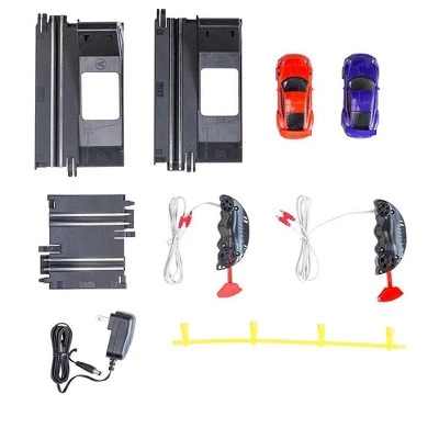 - Track pieces slot together easily (34’L total), and feature straight-aways, curves, loops and a lane change section