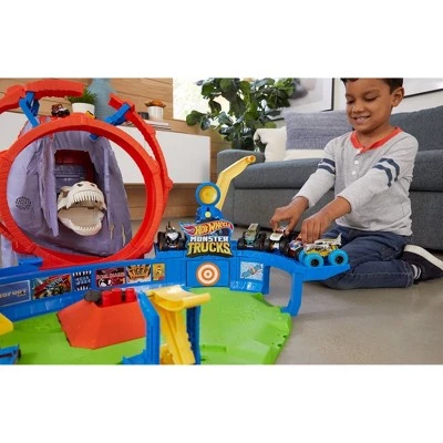 - ​This gigantic Hot Wheels Monster Trucks T-Rex Volcano Arena playset comes to life with lights, sounds, massive loops, a dinosaur nemesis that erupts from the face of the “live” volcano, and lots of action!