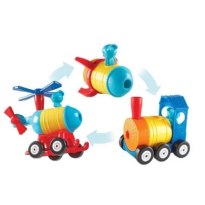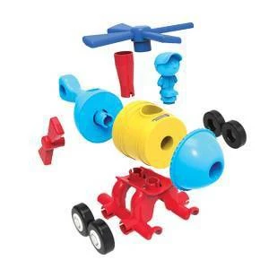 - Includes parts needed for a space-age rocket, old-fashioned train engine, and cartoony helicopter