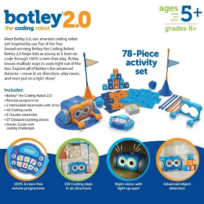 Meet Botley 2.0 The Coding Robot, our smartest coding robot yet! The next generation of our Toy of the Year winner Botley the Coding Robot, Botley 2.0 helps kids as young as 5 learn to code through 100% screen-free play. Botley 2.0 knows multiple ways to code right out of the box—code by color, make Botley move in six directions, and even put on a light show! Discover Botley 2.0’s 16 fun interactions—transform Botley into a train, police car, ghost, and more! You can even test your memory with the lights and sounds of a game of Botley Says! Your little coders can build coding sequences of up to 150 steps, and go on adventures with a built-in sensor that lights up Botley 2.0 in the dark! With the help of Botley’s 78-piece activity set, kids will be solving their first coding and STEM challenges in just minutes!