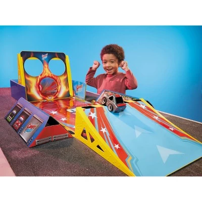 Let ‘em race with the Crazy Fast™ 4-in-1 Dunk’n, Stunt’n Game’n Set™! The sturdy packaging unfolds into a unique 4-in-1 playset for Basketball, Rings of Fire, Cornhole, and Arcade Launch. The realistic looking pull back cars can race up to 50 feet at crazy fast speeds!