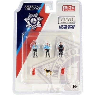 Brand new 1/64 scale of “Metropolitan Police” 8 piece Diecast Set (3 Figurines, 1 Dog and 4 Accessories) for 1/64 scale models by American Diorama.Limited edition.Brand new box.Made of die-cast metal.Comes in a blister pack.Does not come with the car shown.Each figurine is approximately 1 inches tall.Only 3 figurines, 1 dog and 4 accessories will be received.