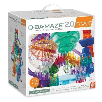 - Every single Q-BA-MAZE stunt inside the Q-BA-MAZE Ultimate Stunt Set! Build, bounce, adjust angles, fine-tune turns and experiment to see what kind of zany, zigzagging action is possible! Includes 156 cubes, 30 marbles, instructions, and all 6 Q-BA-MAZE stunt pieces plus 3 exciting additions—the spiral sphere, quad-exit cubes and marble catchers. One of our bigger Q-BA-MAZE sets: The Mega Stunt Set, which includes 108 colorful cubes, plus fancy stunt pieces to spice up your builds: 2 Cascade Stilts, 2 Coaster Tubes, 1 Marble Vortex, 1 Pivot Trampoline and full-color instructions.
