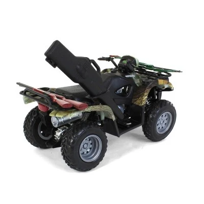 This is a 1/12 Suzuki Vinson 4×4 camo Quadrunner hunting set, and it is made by New Ray. This four-wheeler set would make a great addition to any little hunter’s toy collection. The set includes a four-wheeler, a rifle, a bow, a shotgun, and a gun case. The four-wheeler measures approximately 7″L x 4″W x 4.25″H. This set is recommended for ages 8+ years.