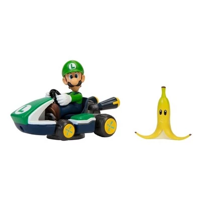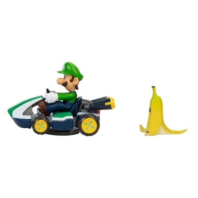 The Spin out Mario Kart – Luigi allows you to recreate your own race anywhere you want. Wind up the kart, press down, and watch out for the banana peel! Front and back triggers activate spin out feature – 360 spins! Includes Mario kart and banana peel accessory. Wind up and GO!