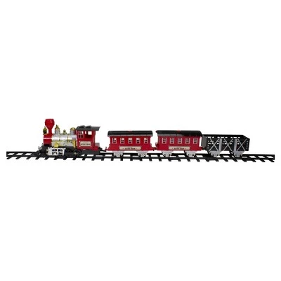 Watch this delightful 24-piece train set circle around your holiday tree. This train set is quick and easy to assemble making this set perfect for young kids.Product features:Track can be configured in either a round or an oval shapeRecommended for ages 3+Makes realistic train soundsLocomotive features a working head light and smoke stack20 pieces of track for a total of over 16 feetIncludes 12 curved and 8 straight track piecesConvenient on/off switchRequires 4 “AA” size batteries (not included)Some easy assembly requiredDimensions of train cars:Locomotive: 6″H x 3.5″W x 12″LBox cars: 4″H x 3″W x 8″LCoal tender: 3.25″H x 3″W x 11.5″LMaterial(s): plastic