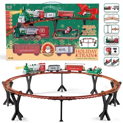 All aboard! This delightful 36-piece train set will bring endless joy to you this holiday season. Watch this festive train set circle around your holiday tree while it makes realistic train sounds. Quick and easy to assemble, this train set is a perfect gift for young children.Product features:Track can be configured in a raised round shapeMakes realistic train soundsLocomotive features a working headlight8 pieces of track for a total of over 8.5 feetIncludes 8 track connectors, 8 curved track pieces8 track stands and 8 stand connectors for raised track supportConvenient on/off switchRecommended for ages 3+Requires 4 “AA” size batteries (not included)Some easy assembly required Dimensions of train cars:Locomotive: 4″H x 9″L x 2.5″WSanta’s sleigh car: 3″H x 6″L x 2.25″WRed Merry holiday car: 3.5″H x 8″L x 2″WSilver coal tender: 3″H x 6″L x 2″WMaterial(s): plastic