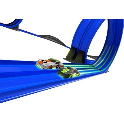 - Includes two track loops, 4 track corners, one lane changer, over 36 feet of glow-in-the-dark track and 2 remote control Tracer Racer cars