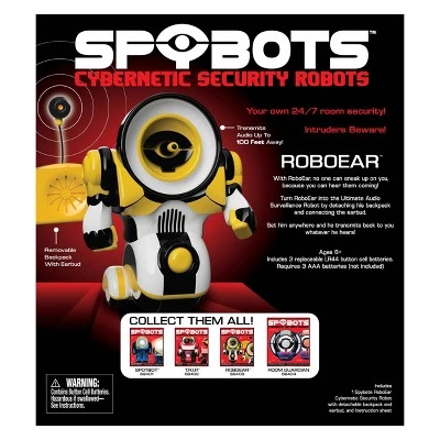Roboear is the ultimate audio-surveillance robot. Just detach his backpack speaker and insert the included earbud. Then station your robot anywhere, and he’ll transmit back to you whatever he hears. Listen to what’s going on downstairs when you’re upstairs – or outside, while you’re inside. Strategically station Roboear, so no one can sneak up on you, because you can hear them coming! Roboear can transmit from up to 100 feet away! Roboear is one of four Spybots Cybernetic Security Robots. Collect them all! Includes 3 replaceable LR44 button cell batteries. Requires 3 AAA batteries (not included). Ages 6+