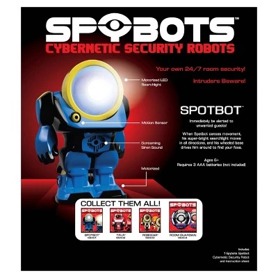 Immediately be alerted to unwanted guests! When Spotbot senses movement, his super-bright LED searchlight head moves in all directions, while his wheeled base drives him around to find your foes. His screaming siren will send intruders running! Spotbot is one of four Spybots Cybernetic Security Robots. Collect them all! Requires 3 AAA batteries (not included). Ages 6+