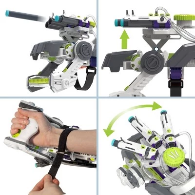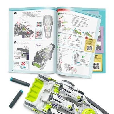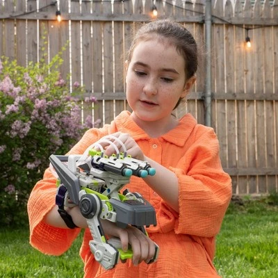 Have a blast with this awesome engineering project! Construct an air-powered robotic glove that launches safe foam darts. Learn about pneumatics — technologies that use pressurized air to perform work — and many cool mechanisms as you assemble the blaster from over 100 pieces. After you’ve built and tested your blaster, slide it on and strap it to your wrist. The first pull of the trigger causes the scissor arm to lift up the barrels and launch the first dart. Pull the trigger two more times to launch the next two darts. Grab some additional darts from the reserve clip under your wrist and reload. The blaster is entirely powered by your hand and the amazing pneumatic system — no batteries or motors required! Turn the dial to rotate the two outer launchers for a wider spread. Adjust the location of the wrist strap to fit almost all hands. A full-color, step-by-step manual guides you through assembling and using the blaster and provides fascinating scientific information about pneumatic systems and the physics of air. Compatible with many standard foam darts. Assembly and troubleshooting videos are also available online via the QR code in the manual.