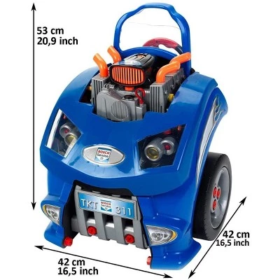 Let your little mechanics and car enthusiast see what’s going on under the hood or race toy cars with this Theo Klein Bosch Car Service Engine Playset.Your kiddo will love tinkering with the detailed plastic engine with any of the 3, large toy tools that really let them attach and remove parts. When tune ups are done and 8 AAA batteries (not included) are added, your little one can turn the ignition key to hear starter sounds, honk the horn, and turn on the headlights. If your kid rather race cars than build them, no worries. It includes a car ramp that attaches to the back so your child can race their favorite toy cars.Recommended for kids ages 3 to 10 years old, this immersive pretend play set can also be moved from room to room thanks to its large wheels and easy handle.Give your kids the chance to tinker, race, and build with the Theo Klein Bosch Car Service Engine Playset.