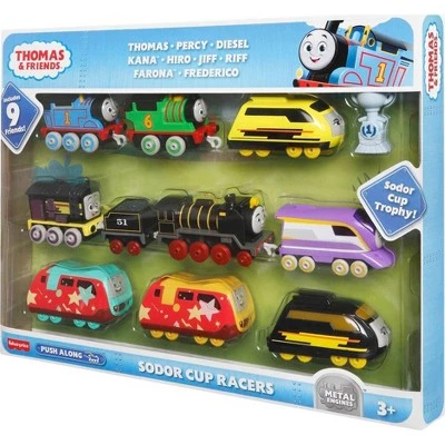 ​Ready, set, race! With this set of 9 Thomas & Friends push-along train engines from Fisher-Price, kids can recreate the Delivery Games from the Thomas & Friends show. Engines from all over the world, including Thomas, Percy, Kana, Diesel, Hiro, Farona, Frederico, Jiff, and Riff, are ready to go speeding down the track and claim victory. Who will win the Sodor Cup? (Additional track sets sold separately and subject to availability.)